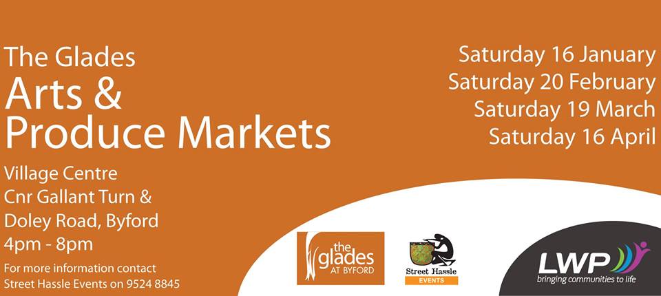 The Glades Arts & Produce Markets are designed to bring together an array of organically grown foods, original handmade arts and crafts and local artisan’s from around Perth. These markets are not open do Direct Sales Consultants. In addition we have live entertainment, children’s activities and gourmet food stalls. The markets will continue to run on the third Saturday of each month from 4pm – 9pm in the Village Centre by Lake Allambee (Cnr Gallant Turn & Doley Road, Byford) | Source from: https://docs.google.com/forms/d/1yi2kGI3AF1D2_fOQSf_LRQwG9N1ckZLYHL0Wjjwlkt4/viewform